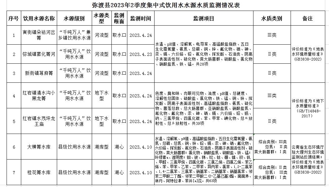 弥渡县2023年2季度集中式饮用水水源水质监测情况表
