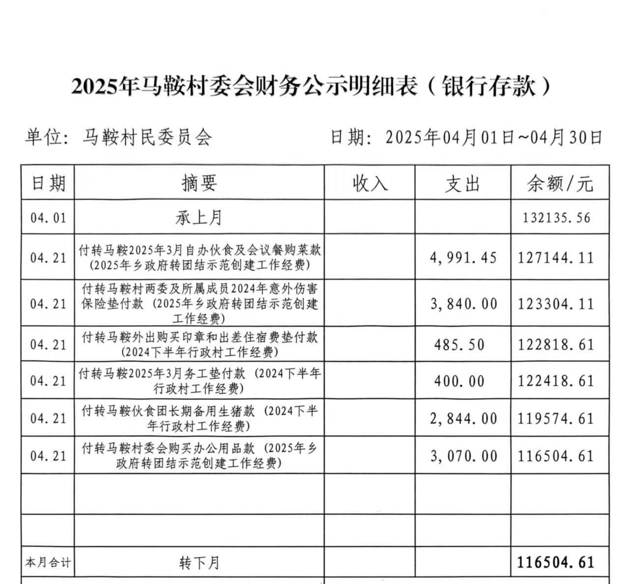 牛街彝族乡马鞍村委会2025年财务公示明细表